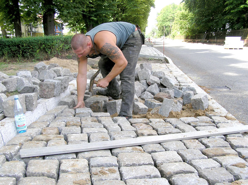 Auch der Fußweg auf der Nordseite der Straße schiebt sich weiter und weiter vor. Heute hat er die Bahnhofstraße 101 erreicht und seine Fühler, die Seitenbegrenzungsplatten, reichen schon bis zur Nr. 103. Ebenso werden jetzt die restlichen Parktaschen auf der Südseite bis zur Schubertstraße mit Druck fertiggestellt (Bild 3). Denn die Mannschaft muss bereit sein für den Einsatz am Westende der Straße, wenn dort nach den Aushubarbeiten die neuen Bordsteine die Voraussetzung für den neuen Straßenaufbau sind.