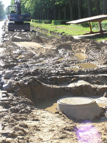 In diesem Abschnitt sind die Verlegearbeiten für den Regenwasserkanal (von der Ruthestraße bis zur Buchenallee auch der Abwasserleitung) ein Hemmnis für den Fortgang des Straßenaufbaues. Die Leitungen müssen verhältnismäßig tief verlegt werden und der Boden ist abschnittsweise lehmig schwer und Wasser stauend (Bild 4). All das verlangsamt den Fortschritt dieser Arbeiten, die aber dem Straßenaufbau vorangehen müssen.