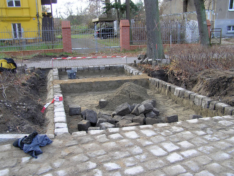 Gleichzeitig gingen die Arbeiten an den Grundstückszufahrten auf der S-Seite der Straße weiter, eigenartigerweise aber nicht in einer erkennbar folgerichtigen Aufeinanderfolge der Arbeitsgänge von Auffahrt zu Auffahrt. So kam es, dass das Pflaster der letzten beiden Auffahrten (vor der Schubertstraße) erst am 20.11. eingerüttelt wurde, obwohl bereits am 8.11. ihre Pflastereinfassung hergestellt (Bild 16-1) und natürlich der Aushub noch früher erfolgt war. Welche Logistik mag hinter diesem Arbeitsablauf gesteckt haben? („Logistik“ – siehe die in Teilen hier sehr zutreffenden Erläuterungen in Wikipedia!).