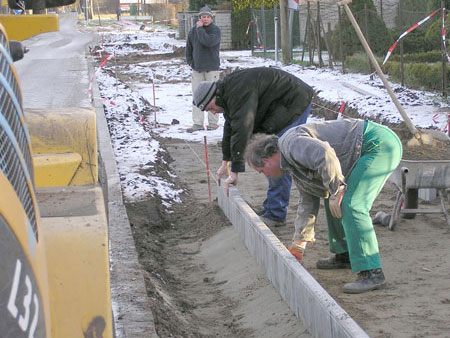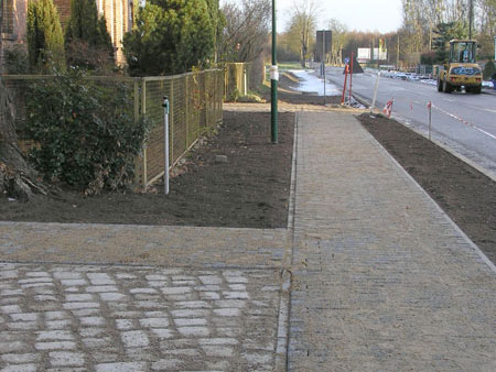 Zuerst wurde zwischen Kiefernallee und Schubertstraße auf mehrere hundert Meter der Mosaikpflasterstreifen zwischen Gehweg und Grundstücksgrenzen verlegt, teilweise auch bei ziemlich schlechtem und nassem Wetter.