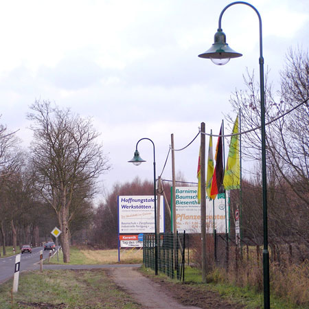 Während die Gehwegerneuerung nur bis zum Ende der Fahrbahnerneuerung wenige Meter östlich der letzten Straßeninsel reicht und in der restlichen Strecke bis zur Straße Sydower Feld der alte Plattenbelag des Gehweges liegen bleibt, wurde die Beleuchtung der Bahnhofstraßenverlängerung bis an diese schon mit Beleuchtung ausgestattete Straße geführt (Bild 16-6)! So ist für die z.T. leicht behinderten Beschäftigten der Baumschule und der Werkstätten der Hoffnungstaler Anstalten auch in der dunklen Jahreszeit zu Arbeitsbeginn und -ende ein sicherer Weg zum Bahnhof ermöglicht.