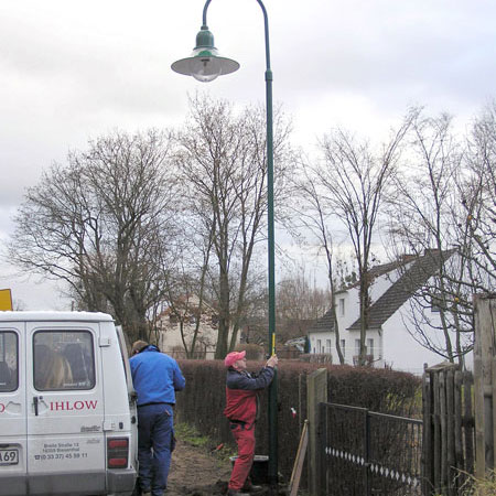 Nachdem die meisten Lampen schon längere Zeit leuchteten, wurden die letzten zwei Abschnitte, vor allem auch der vom Bahnhof bis zum Sydower Feld, noch am Donnerstag dem 6.Dezember zugeschaltet. Hier waren an diesem Tag die letzten der in den Tagen zuvor aufgestellten und verkabelten Masten ausgerichtet und einbetoniert worden (Bild 16-7).