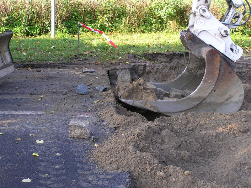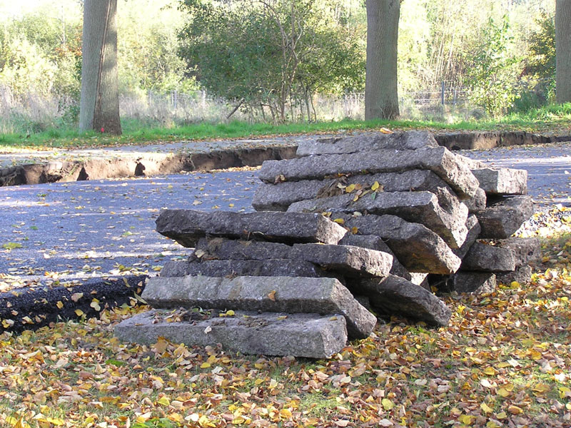 Daher hat sich der Schönheitschirurg mit Namen EUROVIA GmbH der Ruhlsdorfer Straße in Biesenthal angenommen und ihr vom 23. Sept. bis 11. Okt. die Grundzüge eines neuen Gesichtes verschafft. Vom 23. bis 30.09. wurde die Pflastersteindecke aufgenommen. Am 30.09., gegen Viertel vor neun am Morgen begann die Arbeit an dem in Bitumen verlegten letzten Pflaster-Meter (Bild 1) und zehn nach neun wurden die letzten Steine aufgegriffen (Bild 2) und verladen. – Unter der Einwirkung von roher Maschinengewalt war hier ein Zeitalter ganz prosaisch zu Ende gegangen.