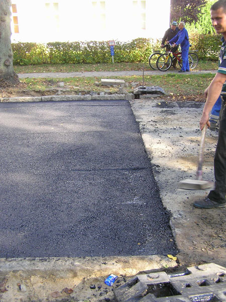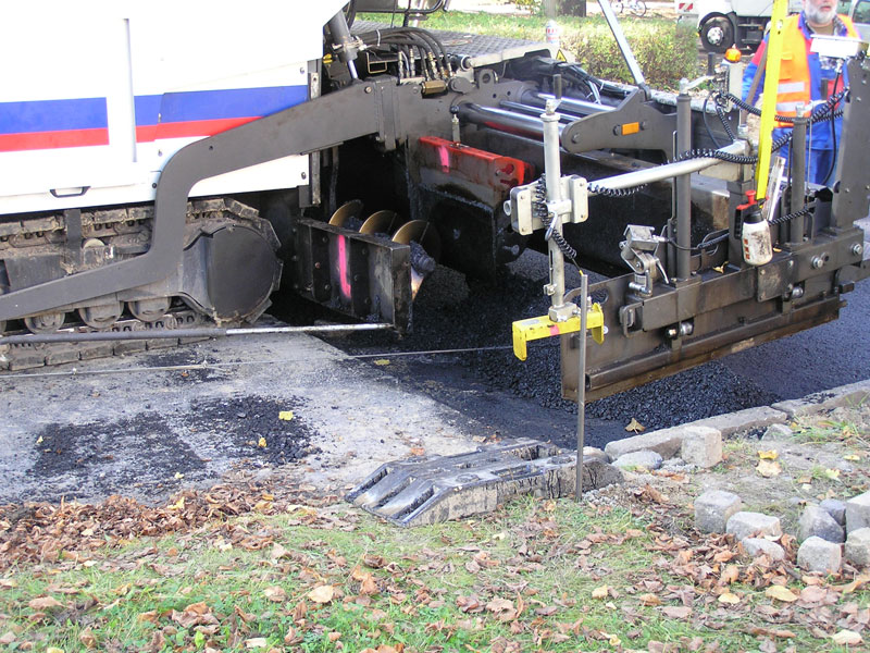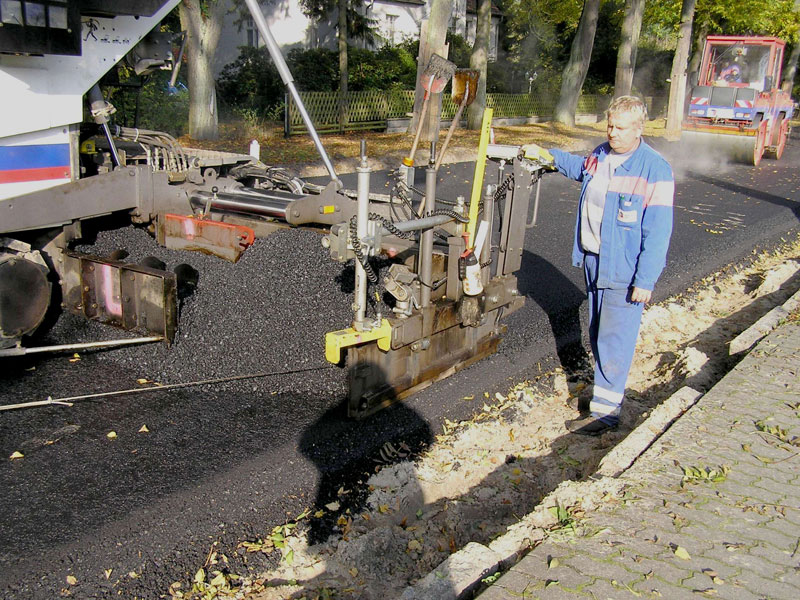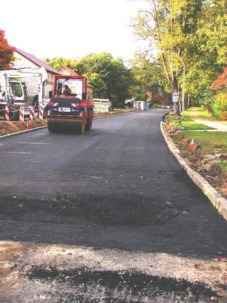 Am 09.10. begann die Asphaltiermannschaft als eingespieltes Team (früher sagte man „Brigade“ dazu): drei Mann auf dem Herzstück, der Asphaltiermaschine, dem sog. „Fertiger“, dazu zwei Walzenfahrer, der Polier und noch ein Mann für Verschiedenes. Das Bitumen-Splitt-Gemisch der Asphalttragschicht wurde in zwei Lagen von zusammen 26 cm Stärke, jeweils in einem Zug in der vollen Breite von 6,00 m aufgebracht. Am 10.10. zu Schichtende war der Anschluss an die vorhandene Straßendecke vor dem Ärztehaus am stadtseitigen Beginn der Ruhlsdorfer Straße erreicht. Die Maschinen waren schon beiseite gefahren als der Berichterstatter nach mehreren Tagen erzwungener Abwesenheit „nachsehen“ wollte. Er konnte nur noch das Ergebnis von zwei Tagen Arbeit dokumentieren (Bild 4). Aber für den nächsten Tag blieb noch das Aufbringen der Binderschicht (5 cm) für das Einfangen von ein paar photographischen Dokumenten.