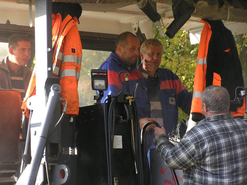 An dem musterhaften Herbstsonnentag des 11.10.2008 sind Viertel vor zehn ca. 100 m Binderschicht aufgebracht, als bis zum Eintreffen des nächsten Kippers mit „Futter“ eine kleine Unterbrechung des sonst immer gleichmäßigen Arbeitsflusses entsteht (Bild 5). Sie wird aber auch genutzt, um entscheidende Maschinenflächen am Fertiger durch Einsprühen gegen Verbacken mit Asphalt zu schützen. Unabhängig vom Stillstand des Fertigers ziehen aber die beiden Walzen auf der schon ausgebrachten Binderschicht immer wieder vor und zurück ihre Bahnen. Nach dem „Andocken“ des nächsten Kippers kann es weitergehen. Die Bilder 6 und 7 untermalen die Devise „Automatisierung ist gut, Kontrolle ist trotzdem notwendig“. Und das gilt für beide Seiten der Maschine.