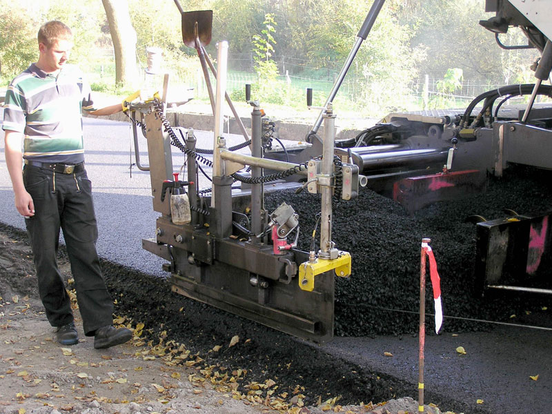 Zeit ist Geld, und so begannen am gleichen Tage (30.09.) die Arbeiten am Erdplanum. Im Gegensatz zur „Konstruktion“ der Bahnhofstraße wird in der Ruhlsdorfer Straße die ebene Unterlage für die Asphaltschichten nicht durch eine Betonrecycling-Schotterschicht geschaffen, deren ebene Oberfläche durch maschinelles Einbringen garantiert wäre. Diese Schicht und damit ein arbeits- und zeitaufwändiger Arbeitsgang wird eingespart. Ihre Tragfunktion wird durch eine größere Dicke der maschinell aufgebrachten Asphalt-Tragschicht erreicht. Die ebene Unterlage für diese Asphaltschicht muss bei dieser Variante des Aufbaues des Straßenkörpers durch sorgfältigstes Arbeiten mit dem Schaufellader bei der Herstellung des Erdplanums geschaffen werden (Bild 3). Mit ihm muss die notwendige ebene Fläche geschaffen werden. Diese Fläche muss auch schon die minimale seitliche Neigung haben, die dann auf der Asphaltoberfläche für das Abfließen des Wassers sorgt. Die Arbeit des Schaufellader-Fahrers ist also Filigran-Arbeit mit grobem Gerät. Sie wird ihm erleichtert durch die entlang der gesamten Baustrecke gespannten Schnüre. Ihre Richtung und ihre Höhe ist vom Vermesser kontrolliert. Ein Laserstrahl-Gerät erleichtert die ständige Höhenkontrolle durch einen zweiten Mann.