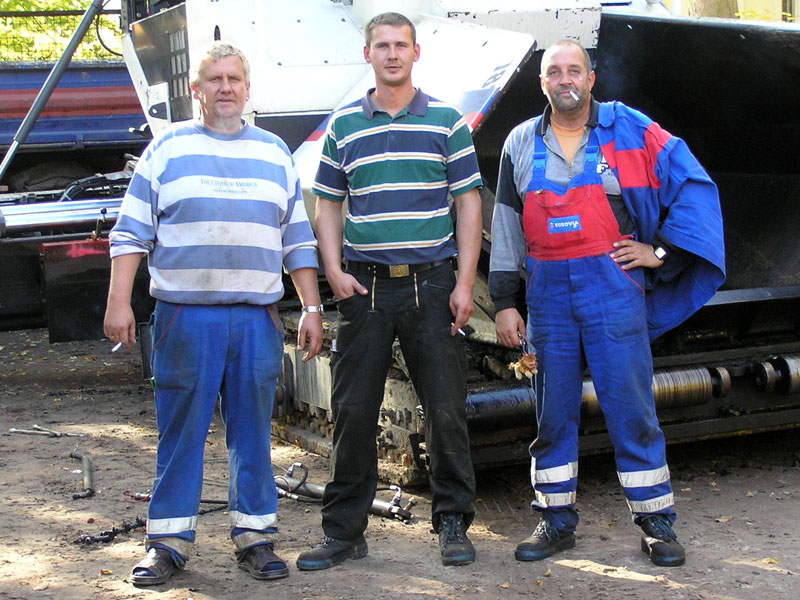 Drei Stunden später. Die Karawane mit dem „Fertiger“ und den zwei Walzen ist am stadtseitigen Ende „der Ruhlsdorfer“ vor dem Ärztehaus angekommen. Der Fertiger kann konstruktionsbedingt nicht bis an den vorhandenen Asphalt ranarbeiten. Er schüttet den Rest der Asphaltmasse ab, hebt als untrügliches Zeichen des Arbeitsendes der Maschine die seitlichen Führungsbleche für den Asphaltauftrag (Bild 8) und fährt auf die Geräte-Abstellfläche. Zwei der Mannschaft verteilen den abgeschütteten Rest auf die verbliebenen 1,5 m der Straße (Bild 9). Aber für einen halben Quadratmeter reicht die Masse nicht mehr. Fünf Schaufeln müssen noch aus dem großen Topf geholt werden, dann ist es geschafft . Die Walze kann kommen. Fünf Minuten später ist auch das erledigt (Bild 10). Schnell setzt große Betriebsamkeit wegen der vielen Handgriffe ein, die für die Vorbereitung des Fertigers für seinen Tieflader-Abtransport über das Wochenende noch notwendig sind. Und Samstag in der vierzehnten Stunde zieht natürlich das Wochenende. Sicher haben alle auch noch einen langen Weg nach Hause. Aber die Maschinenbesatzung des Fertigers hat dennoch Zeit für ein Erinnerungsfoto (Bild 11).