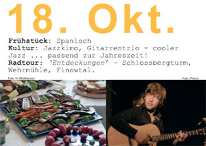 Nach der sehr beliebten Matinée im September mit 70 Gästen möchten wir diesen Erfolg natürlich wiederholen. Am Sonntag, 18. Oktober gibt es ab 11 Uhr ein leckeres spanisches Bio-Buffet und ab 12 Uhr Jazz vom Gitarrentrio Jazzkimo.
