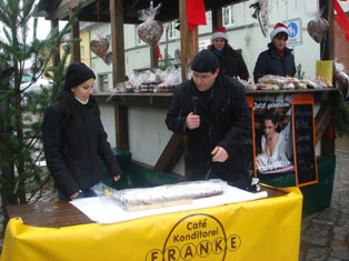 Lassen Sie sich von unserem reichhaltigen Angebot an weihnachtlichen Genüssen, wie gebrannten Mandeln und Nüssen, kandierten Äpfeln, Zuckerwatte, Popcorn, Lebkuchen, Waffeln, Crêpes, Gebäck, Quarkkeulchen und selbst gebackenem Kuchen überraschen.