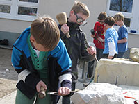 In der Grundschule „Am Pfefferberg“ in Biesenthal wurde vom 23. bis zum 25. April 2013 der Unterrichtstag ganz anders als sonst gestaltet. Die Projekttage standen unter dem Thema „Werkstatt-Arbeit“. Statt mit Füller und Stift hantierten die Kinder mit Hammer, Säge, Farben und Kleister, Holz und Stein. Es wurden Wände im Haus und an der Schulhofmauer bunt bemalt, Elemente zum Ausschmücken von Aula und Klassenräumen angefertigt und Stühle künstlerisch umgestaltet. Die Großen versuchten sich als Bildhauer und Steinmetze mit tollen Ergebnissen. Es ging aber auch nach Altranft, um alte Handwerkstechniken wie das Korbflechten oder das Schmieden kennen zu lernen. Und überall in beiden Schulhäusern saßen oder flogen Vögel als Symbol des Aufbruchs, in den verschiedensten Techniken angefertigt. Die Klasse 5a hatte den Auftrag, alles mit Fotos und kleinen Filmsequenzen zu dokumentieren. Im Internet und auf den Wandzeitungen kann man noch einmal einen Einblick in die fleißige Arbeit der drei Tage erhalten.
