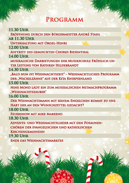 Am Sonnabend, den 30. November 2013, laden wir alle Biesenthalerinnen, Biesenthaler und Gäste ganz herzlich ab 11.30 Uhr bis ca. 19.30 Uhr zum Bummeln auf unseren diesjährigen Weihnachtsmarkt ein. Es locken viele Geschenkideen zum Fest und ein abwechslungsreiches Programm auf der Bühne und im Rathaus für Jung und Alt.