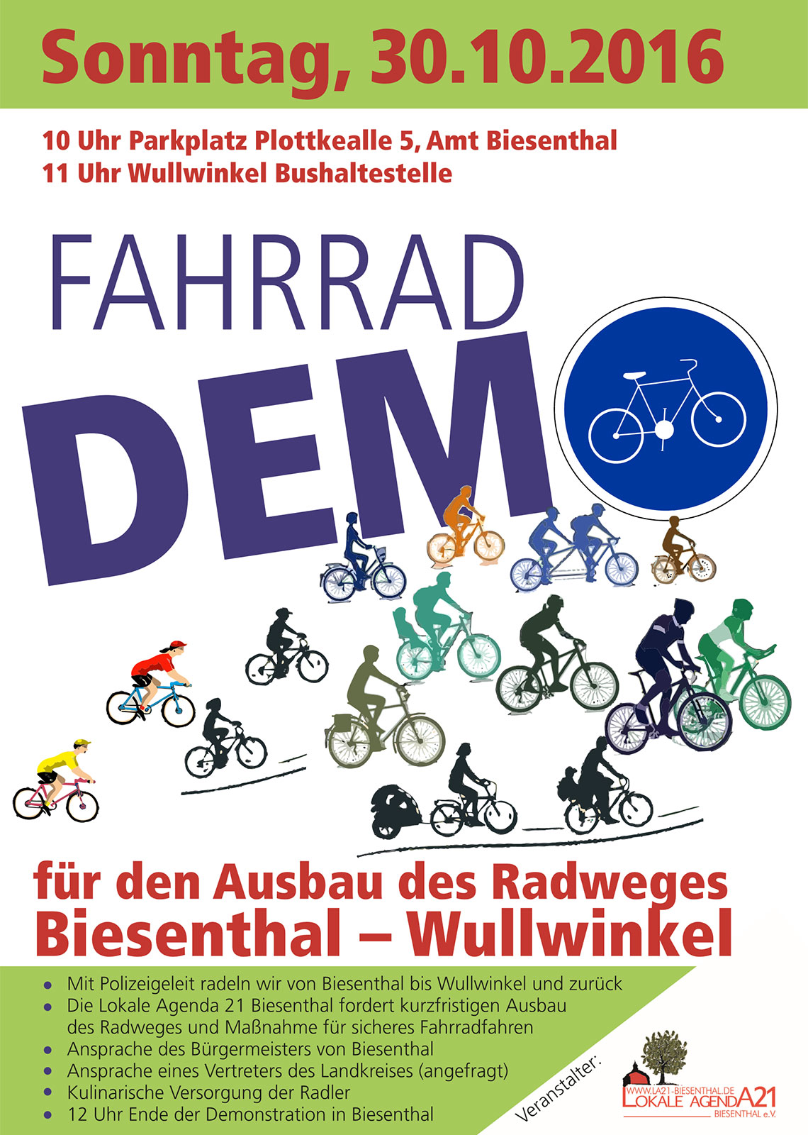 Start ist um 10.00 Uhr auf dem Parkplatz der Amtsverwaltung in der Plottkeallee. Um 11.00 Uhr wollen wir in Wullwinkel an der Bushaltestelle gemeinsam mit dem Bürgermeister von Biesenthal und einem Vertreter des Landkreises unsere Forderungen präsentieren. Danach geht es auf dem Rad zurück nach Biesenthal. Das Ende der Demonstration ist für 12.00 Uhr geplant.