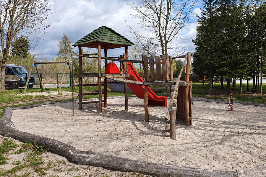 Ganz bewusst hat man sich bei der Gestaltung des Spielplatzes für die Verwendung von nachhaltigen und langlebigen Materialien entschieden. Neben Holz kommt daher auch Recyclingkunststoff zum Einsatz. Durch das robuste Material splittert nichts ab und das Spielgerät hält dadurch einer starken Beanspruchung sowie Wind und Wetter stand.