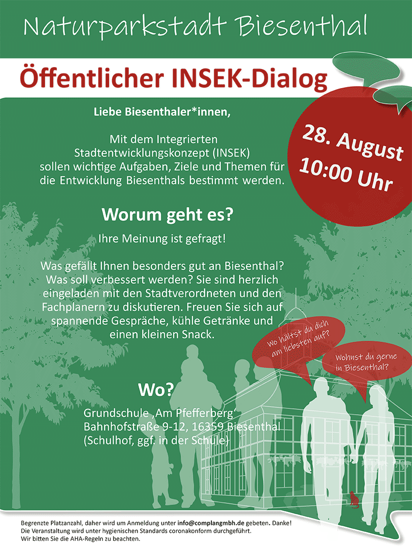 Mit dem Integrierten Stadtentwicklungskonzept (INSEK) sollen wichtige Aufgaben, Ziele und Themen für die Entwicklung Biesenthals bestimmt werden.
