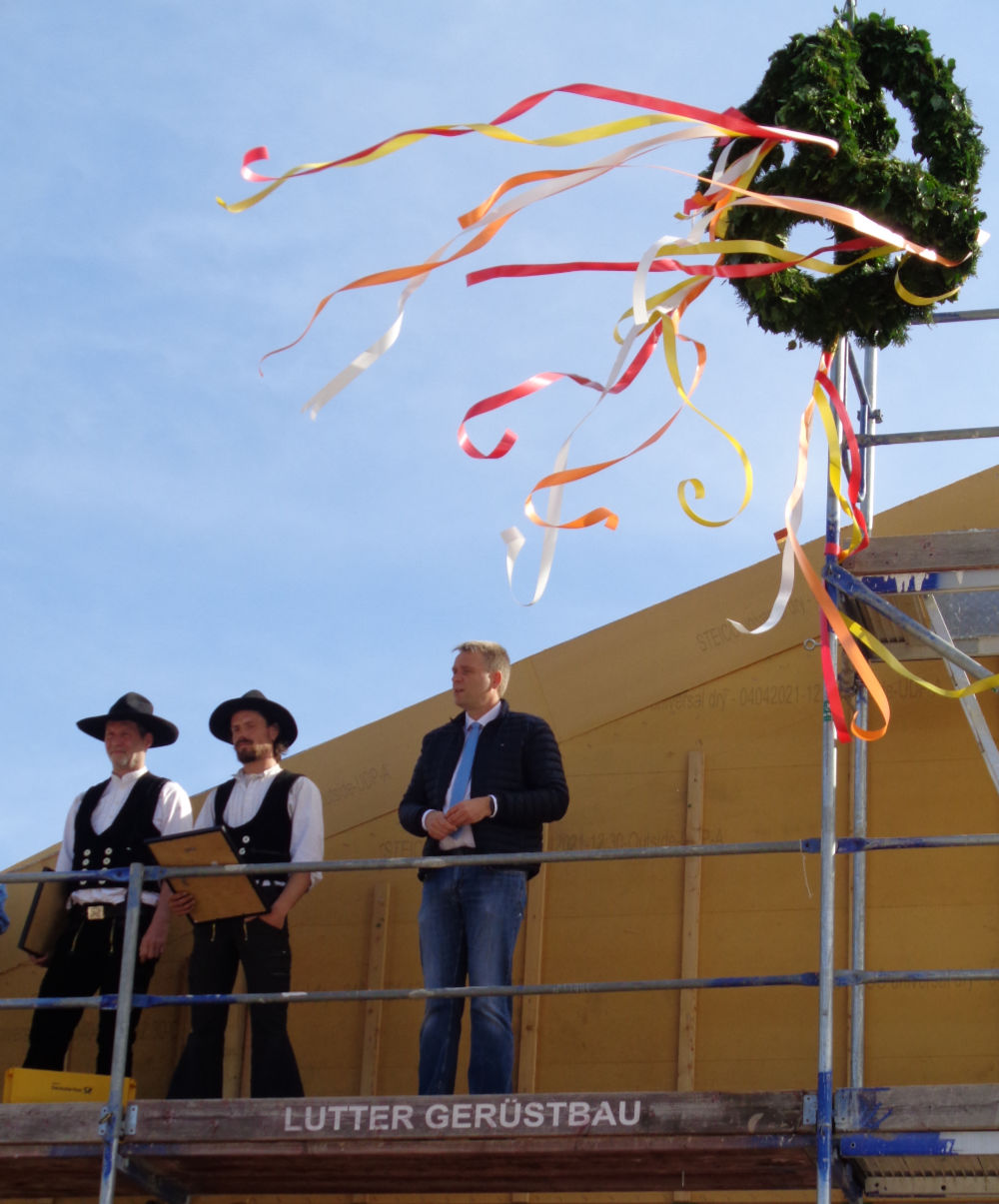 Gemeinsam mit dem Amtsdirektor Herrn Andre Nedlin, dem ehrenamtlichen Bürgermeister Herrn Carsten Bruch, Mitgliedern der Stadtverordnetenversammlung, Vertretern des Planungsbüros und der bauausführenden Firmen, sowie Vertretern der MAHALE GmbH und weiteren Gästen wurde das Richtfest begangen. Nach einigen offiziellen Worten und dem Richtspruch, welcher in unterhaltsamer und inhaltsreicher Form durch die Zimmermänner der Firma Feuerbach vorgetragen wurde, sowie dem obligatorischen Nageleinschlag wurde auf den Neubau angestoßen. Möge das Bauwerk standfest sein und die neuen Bewohner stets von Glück und Segen begleitet werden.