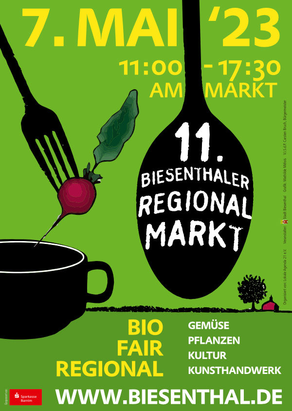 Schnapszahl! Nun zum 11. Male findet er statt, der Biesenthaler Regionalmarkt. Am Sonntag, den 7. Mai 2023, werden wieder Marktstände, eine Bühne und viele Gäste den Platz vor dem historischen Fachwerkrathaus rund um die Jubiläumseiche beleben. Um 11 Uhr geht es los, mit bunten Ständen, welche die vielfältigen Produkte aus unserer Region anbieten: frische Salate und leckerer Käse aus dem Barnim, Jungpflanzen für den Garten, Honig, Wurst und Wildfleisch aus der Uckermark, diesmal sogar handgemacht Liköre und vieles mehr, meist aus ökologischem Anbau. Hier können Sie die Bäuerinnen und Bauern direkt kennen lernen und mit ihnen ins Gespräch kommen.