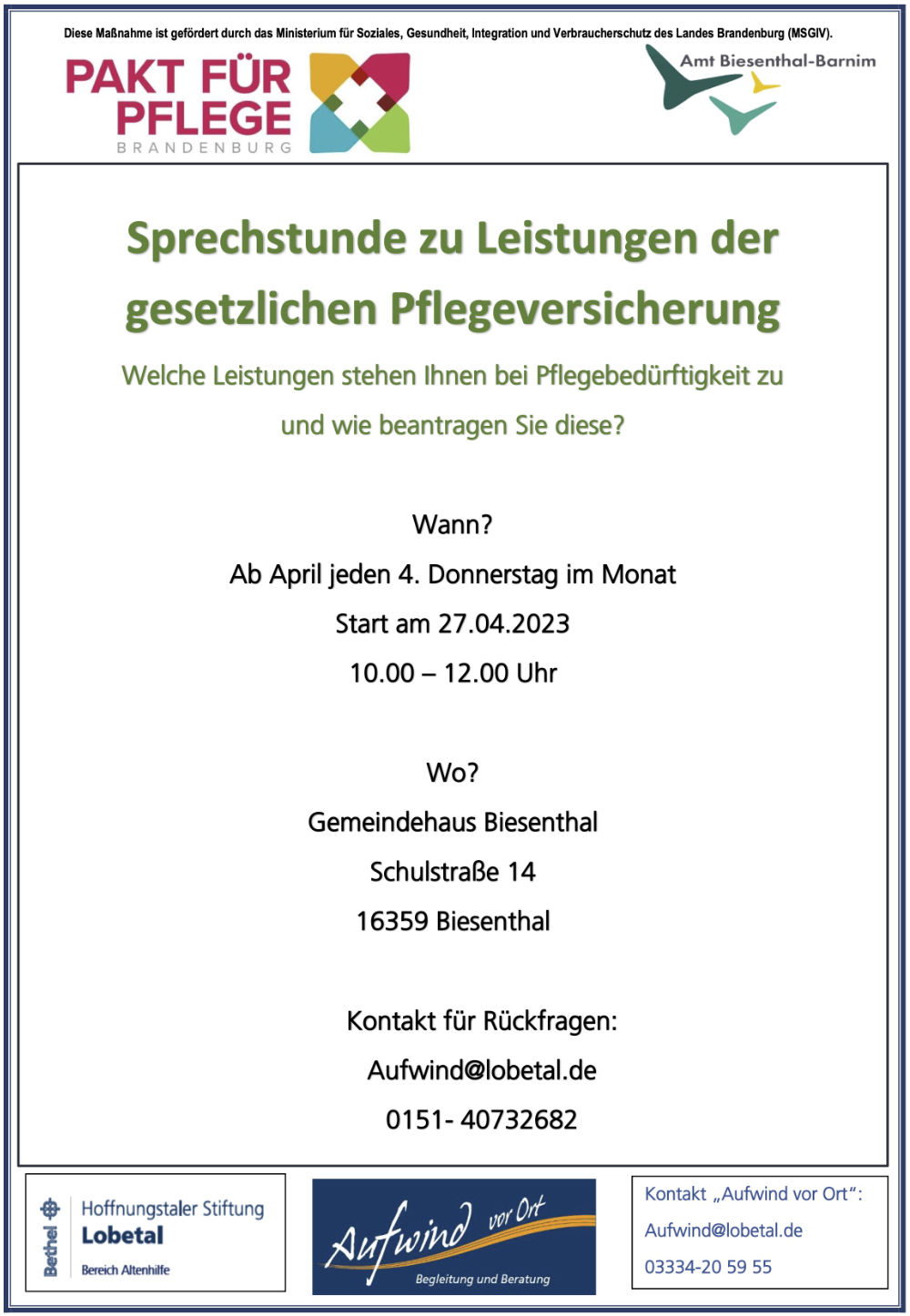 Künftig haben Sie die Möglichkeit, sich zum Thema Leistungen der gesetzlichen Pflegeversicherung niedrigschwellig in Biesenthal beraten zu lassen. Dabei ist es unerheblich, ob Sie pflegender Angehöriger oder selbst auf Pflege angewiesen sind. Ebenfalls spielt es keine Rolle, ob berets ein Pflegegrad vorhanden ist und in welcher gesetzlichen Pflegekasse Sie Mitglied sind. Die Sprechstunde findet jeden 4. Donnerstag des Monats im Evangelischen Gemeindehaus Biesenthal, Schulstraße 14 statt. Der erste Termin ist Donnerstag der 27.04.2023. Das Angebot ist für Sie kostenfrei. Eine Anmeldung ist nicht notwendig, kommen Sie gern vorbei. Bei Rückfragen kontaktieren Sie 03334 – 205 955 oder alternativ per Mail: aufwind@lobetal.de.