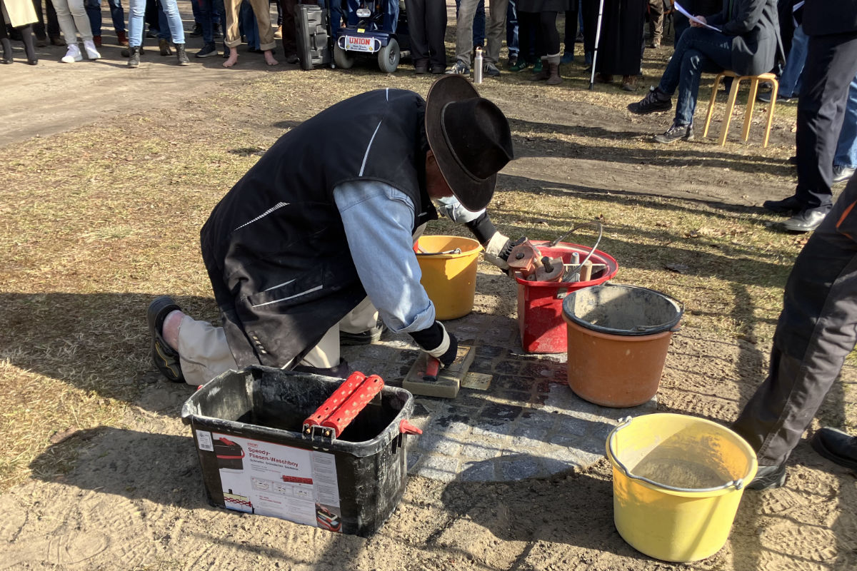 Nach den Redebeiträgen setzte Gunter Demnig den ersten Stolperstein in Biesenthal persönlich in das Pflaster der Hardenbergstraße.