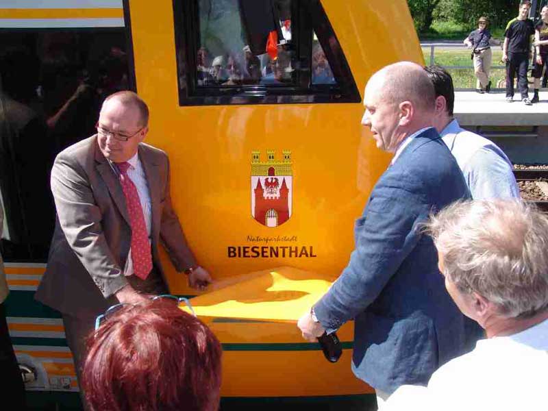 Hunderte von Neugierigen machten am Sonnabend der Einweihung der Bahnhofstraße und der Namenstaufe eines ODEG-Triebwagens auf den Namen „Naturparkstadt Biesenthal“ einen „großen Bahnhof“. Brandenburgs Verkehrsminister Reinhold Dellmann ließ es sich nicht nehmen, persönlich seine Glückwünsche zu überbringen. Gemeinsam enthüllten ODEG-Geschäftsführer Dietmar Knerr, Bürgermeister André Stahl und Dellmann den neuen Schriftzug und das Wappen am Fahrzeug, das schließlich von Knerr mit Sekt getauft wurde. weiter
