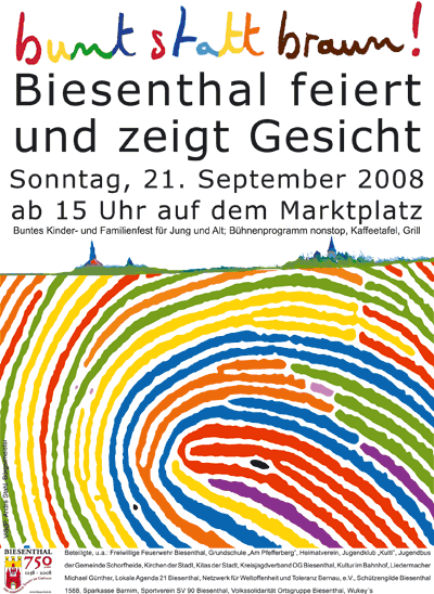 Am 21. September fand in Biesenthal auf dem Marktplatz unter reger Beteiligung vieler Vereine und Bürger der Stadt das Familienfest unter dem Motto: „Bunt statt braun“ statt. An dieser Stelle möchte ich mich bei allen beteiligten Vereinen, der Feuerwehr, dem Kulti, den Jugendeinrichtungen des Amtsbereiches, der KITA Schützenstraße, der KITA „Knirpsenland“ Bahnhofstraße sowie der Grundschule „Pfefferberg“ und der Musikschule Fröhlich bedanken. Unser Dank gilt auch all den Mitstreitern, die mit ihren Beiträgen zum Gelingen des Festes beigetragen haben.