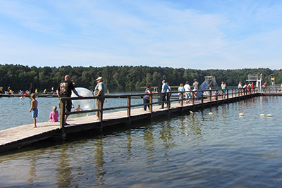 Die Steganlage im Strandbad Wukensee wird nach der dies­jährigen Badesaison ab September komplett erneuert. Der Haupt­ausschuss beschloss, die Oranienburger Fachfirma ROWA Wasserbau mit den Arbeiten zu beauftragen. Bis Mai wird die Firma die Steganlage instandsetzen, so dass die Bade­gäste im Sommer die vom Wasser dauer­beanspruchten Bretter ohne Gefahr begehen können. Der Neubau wird 202.000 Euro kosten.