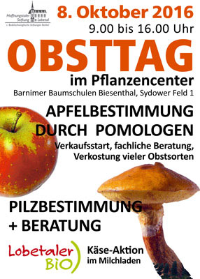 Zum traditionellen Obsttag am zweiten Oktoberwochenende laden die Barnimer Baumschulen am Sonnabend ins Sydower Feld 1 ein. Von 09.00 bis 16.00 Uhr können viele Obstsorten gekostet und die entsprechenden Bäume oder Sträucher gleich für den eigenen Garten erworben werden. Ein Pomologe bietet die Bestimmung mitgebrachter Äpfel an. Zur Herbstzeit darf natürlich die Pilzbestimmung nicht fehlen, und der Milchladen lockt mit einer „Käse-Aktion“. [lb]