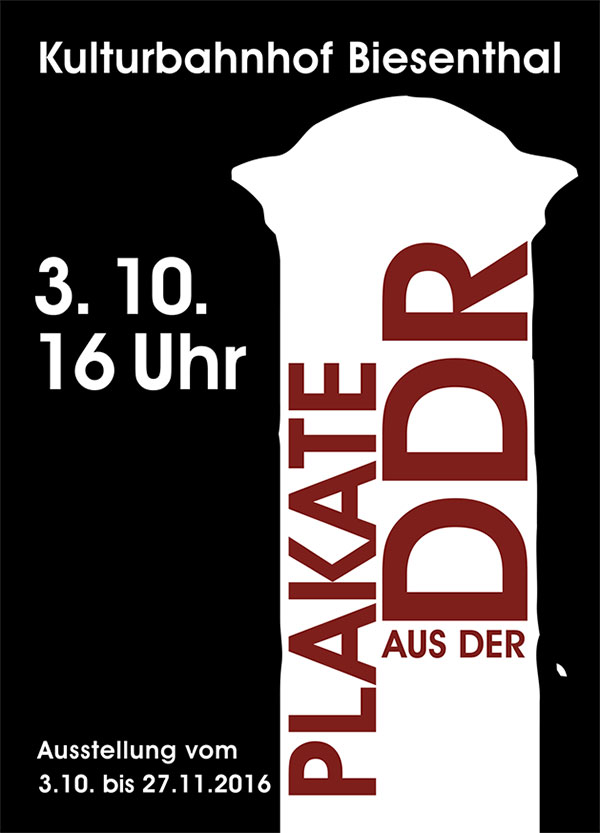 In Kooperation mit der Stiftung Plakat OST zeigt der Kulturbahnhof Biesenthal im Oktober und November 2016 die Ausstellung »Plakate aus der DDR«. In der Ausstellung werden Beispiele aus allen Themenbereichen des Plakates in der DDR gezeigt, von Kultur und Politik zu sozialen Themen und Produktwerbung. Die Ausstellung ist bis zum 27. November 2016 immer Samstag und Sonntag von 14.00 bis 17.00 Uhr geöffnet.