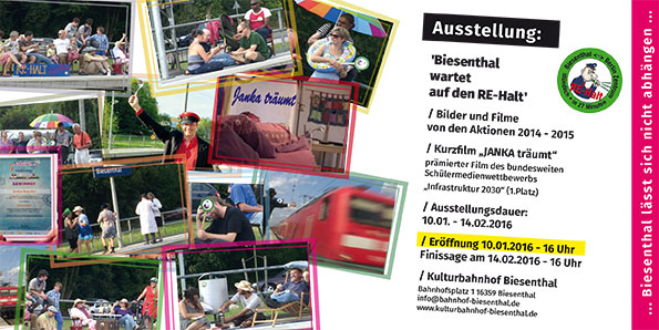 In der ruhigen Zeit nach den Feiertagen lädt der Kulturbahnhof Biesenthal am Sonntag den 10. Januar um 16 Uhr zu einer neuen Ausstellung ein: „Biesenthal wartet auf den RE-Halt“. Es werden Bilder und Videos von den Aktionen des bunten und vielfältigen Protestes gegen die Fahrplanänderung zum Dezember 2014 und für eine bessere Bahnanbindung gezeigt. Auch der preisgekrönte Kurzfilm „Janka träumt“ aus einem bundesweiten Schülerwettbewerb zum Thema „Infrastruktur 2030/ so will ich morgen mobil sein“ ist zu sehen. mehr...