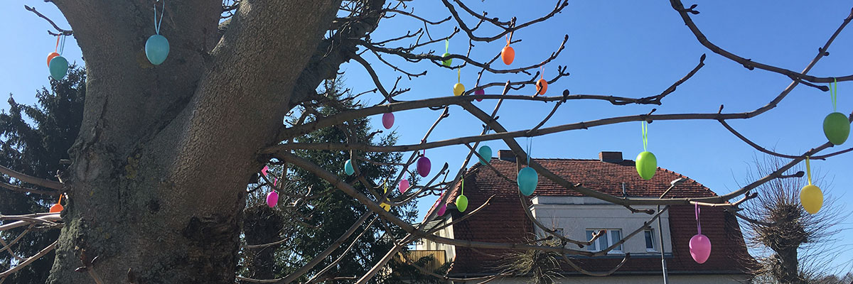 Die Redaktion wünscht allen Leserinnen und Lesern sonnige Osterfeiertage. Für die bunten Ostereier in den Bäumen rund um den Marktplatz und vor der Möbelfolie (Foto) danken wir Margitta Mächtig und Helfern.