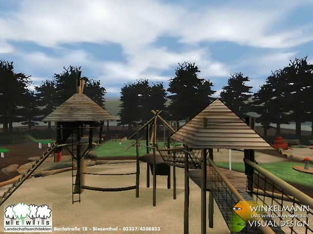 Baumhaus und Spielanlage vom Hügel aus gesehen
