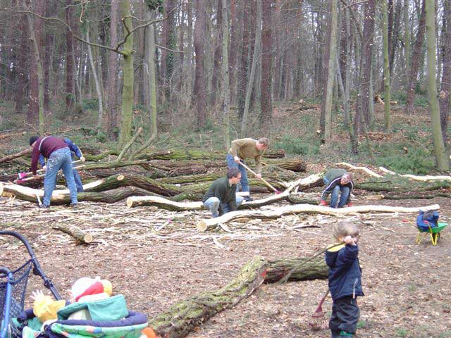 Arbeitseinsatz am 1.4.06: Die Baumstämme werden geschält.