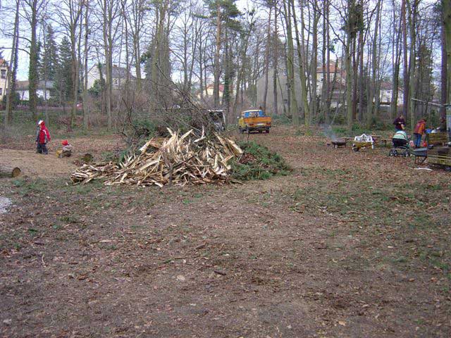 Arbeitseinsatz am 1.4.06: Die Baumstämme werden geschält.